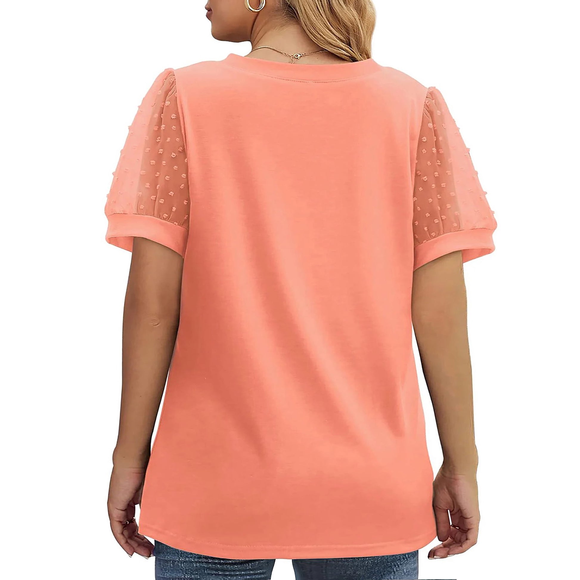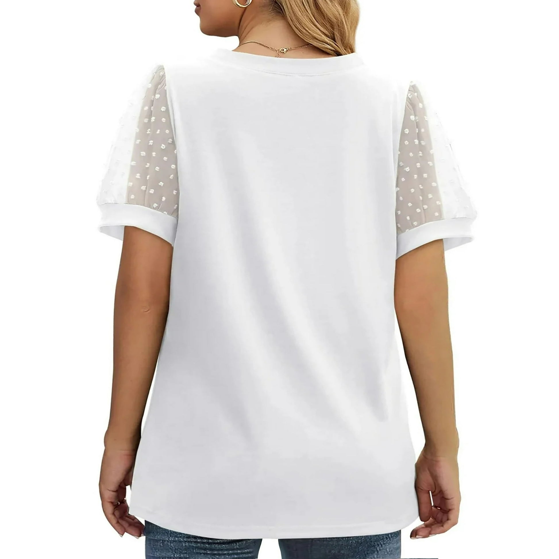 💕【Key Features】: These womens tops boast an elegant v-neckline paired with delicate Swiss dot puff sleeves, creating a graceful and sophisticated aesthetic. The loose fit and flexible fabric make them a versatile choice, suitable for various occasions and seasons.
